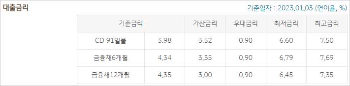 (2) 가산금리: 고객별 가산금리는 신용등급, 대출기간 등에 따라 차등 적용됩니다. 종합통장자동대출 선택 시 연 0.50%p 추가 가산됩니다.